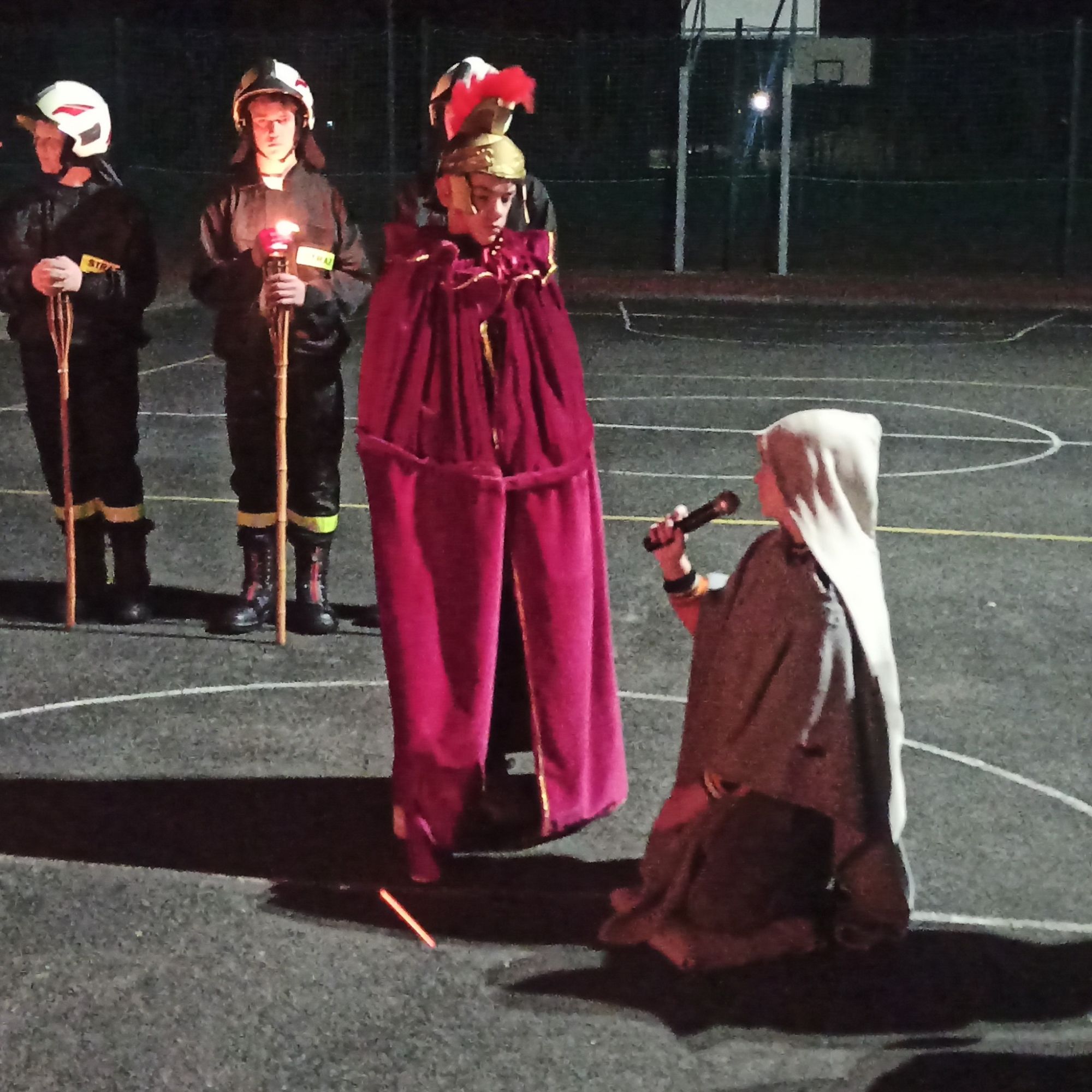 To wyjątkowe wydarzenie zgromadziło licznych mieszkańców Nowej Schodni, a w szczególności dzieci oraz całą społeczność szkolną. Uroczystość rozpoczęła się tradycyjnie od mszy świętej odprawionej przez księdza Dominika Sowę. Następnie, w blasku lampionów i pochodni, przy dźwiękach orkiestry dętej, wszyscy przeszli ulicami Nowej Schodni aż na plac przy Szkole Podstawowej nr 2 w Ozimku. Wśród gości był pan Marcin Widera - Zastępca Burmistrza Ozimka, pan Antoni Gryc i pan Zygmunt Olbryt. Na miejscu odbyła się piękna inscenizacja przygotowana przez uczniów naszej szkoły, która zachwyciła wszystkich zgromadzonych gości. Dzieci z zaangażowaniem przedstawiły historię Świętego Marcina – symbolu dobroci, empatii i dzielenia się z potrzebującymi. Na wszystkich czekały przepyszne rogale świętomarcińskie oraz wiele zabaw przy ognisku. Serdeczne podziękowania kierujemy do wszystkich, z którymi mogliśmy dziś zorganizować to wydarzenie: DFK Nowa Schodnia, Sołtysa i Rady Sołeckiej, Strażaków z OSP Schodnia, którzy czuwali nad bezpieczeństwem uczestników podczas przemarszu. To był wyjątkowy dzień pełen radości, wspólnego świętowania i pielęgnowania pięknych tradycji.