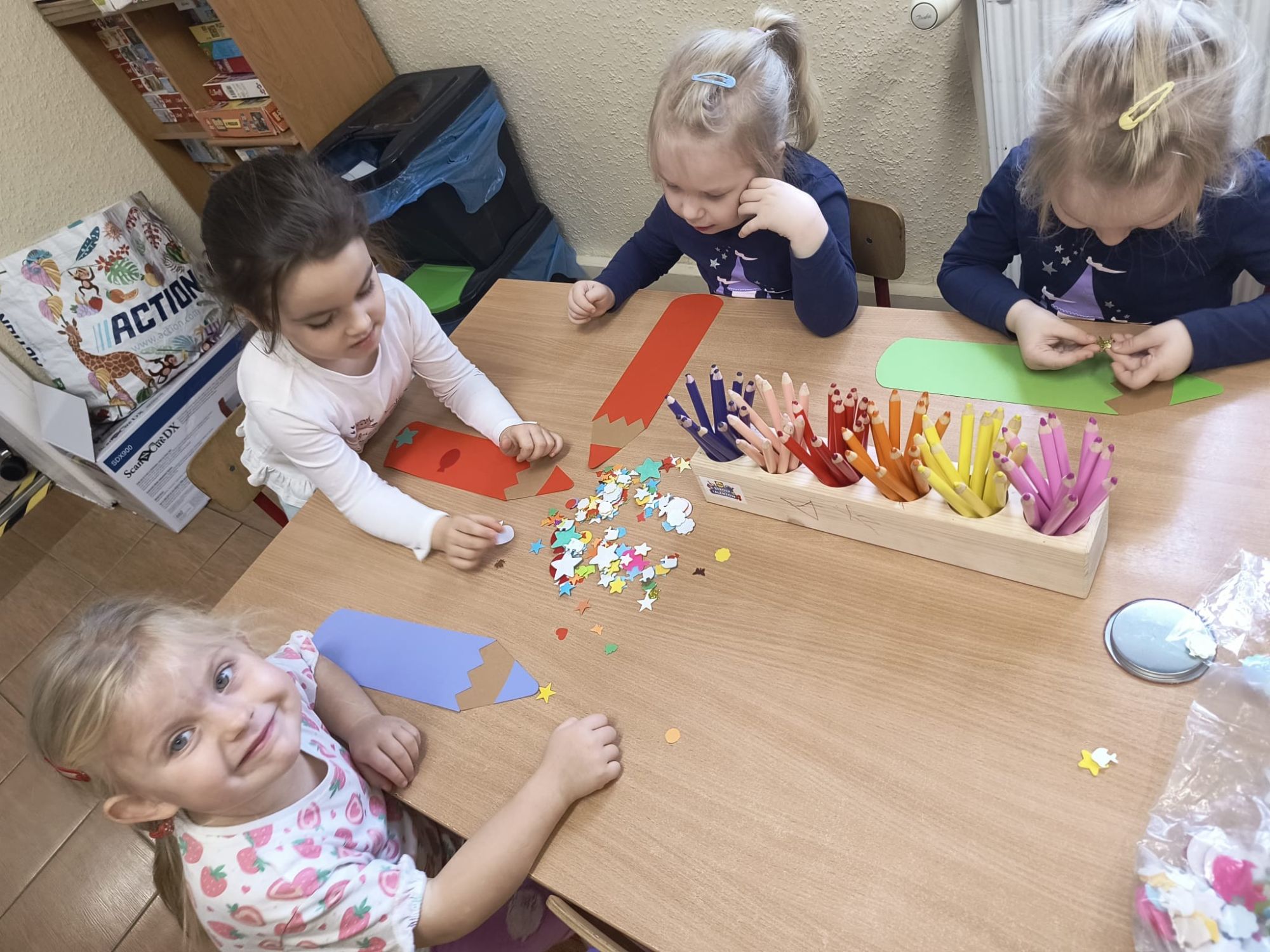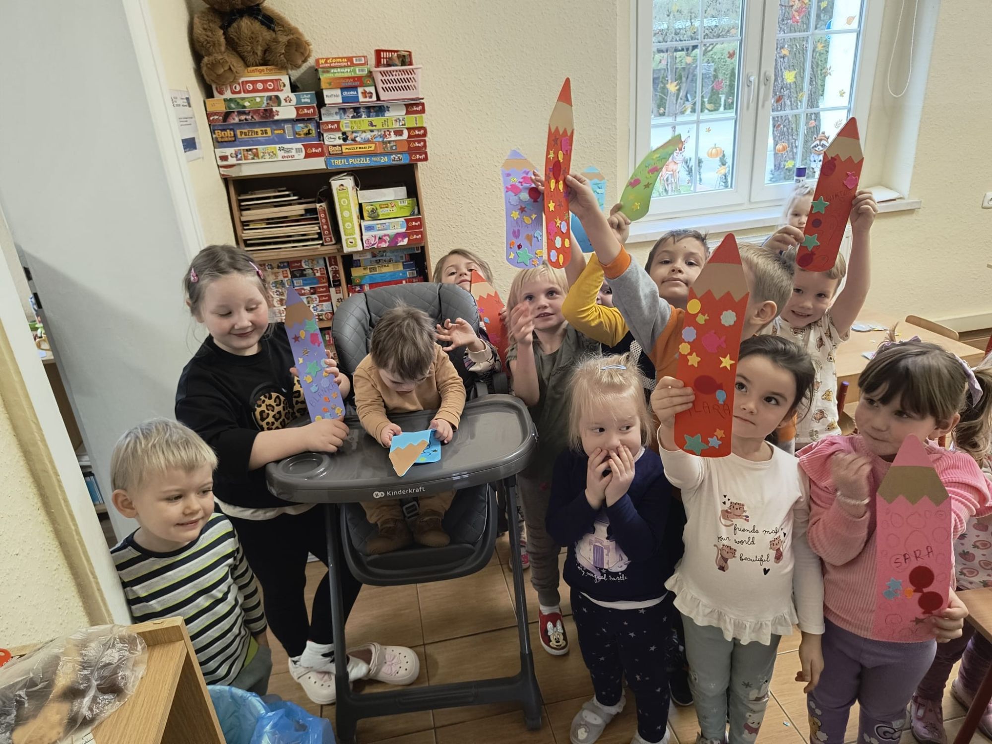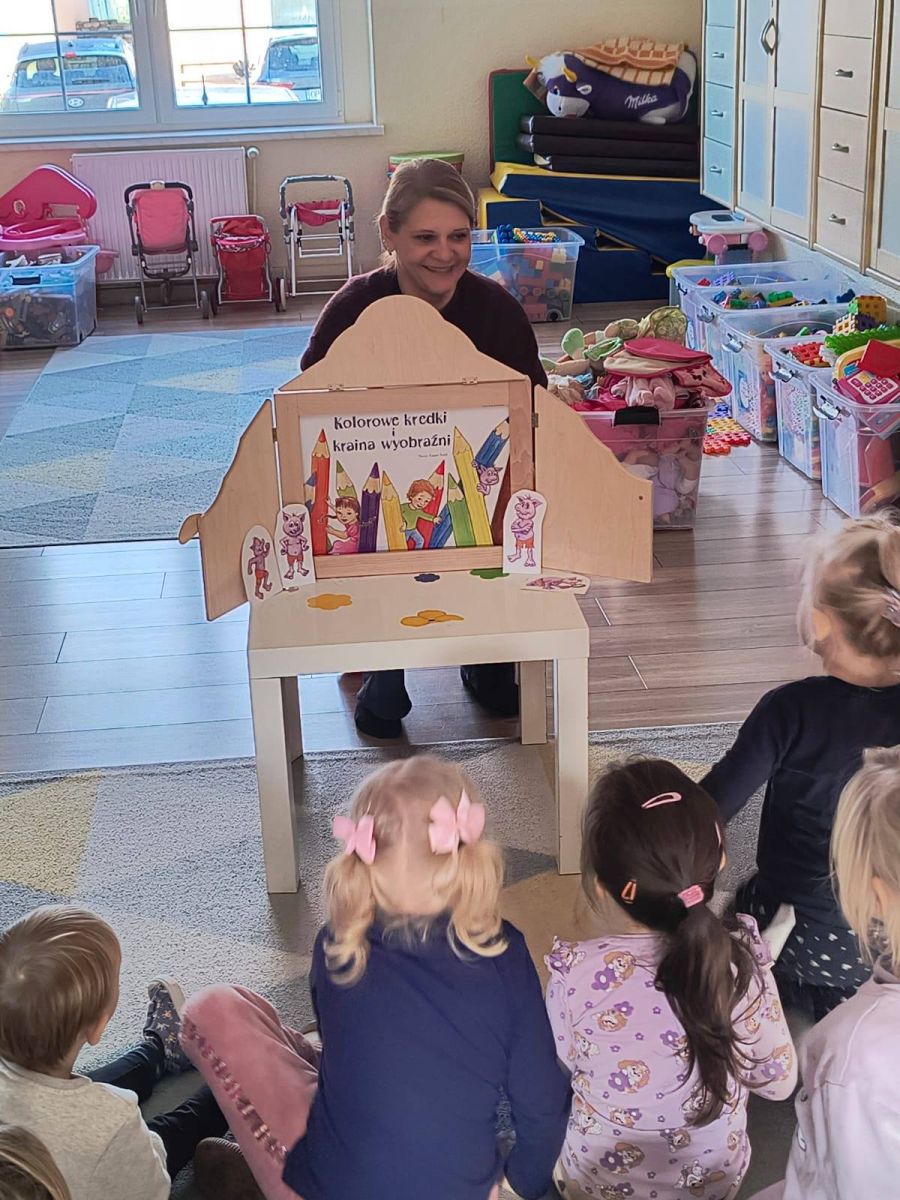 W minionym tygodniu w naszym przedszkolu świętowaliśmy Dzień Kredki – jedno z naszych ulubionych, pełnych kolorów i twórczej zabawy wydarzeń! Dzieci wykonały piękne prace plastyczne, wykazując się ogromną wyobraźnią i talentem. Każda kredka zamieniła się w narzędzie magicznego tworzenia, a sala w prawdziwą pracownię małych artystów. W rytm dobrze wszystkim znanej piosenki „Kolorowe kredki” przedszkolaki brały udział w zabawach muzyczno-ruchowych, wykonując ćwiczenia powiązane z wybranymi kolorami oraz odnajdując w sali przedmioty w odpowiadających im barwach. Było dużo ruchu, śmiechu i wspólnego odkrywania kolorowego świata! Z tej okazji odwiedziła nas także pani Agata z teatrzykiem kamishibai pt. „Kolorowe kredki i kraina wyobraźni”, zabierając dzieci w niezwykłą podróż pełną kolorów, opowieści i kreatywnej inspiracji.