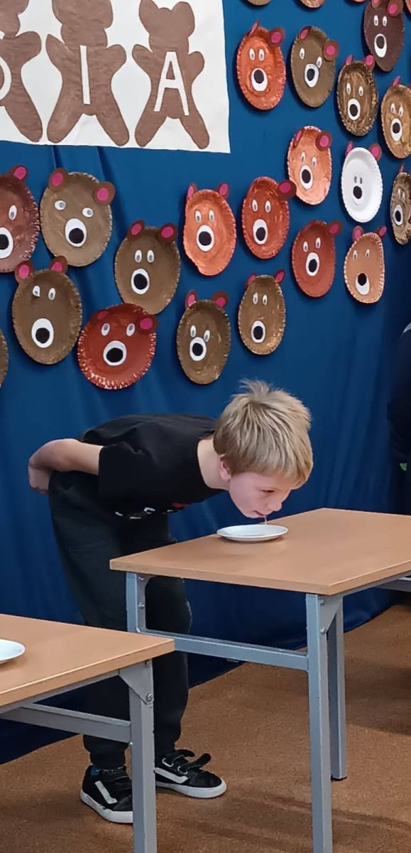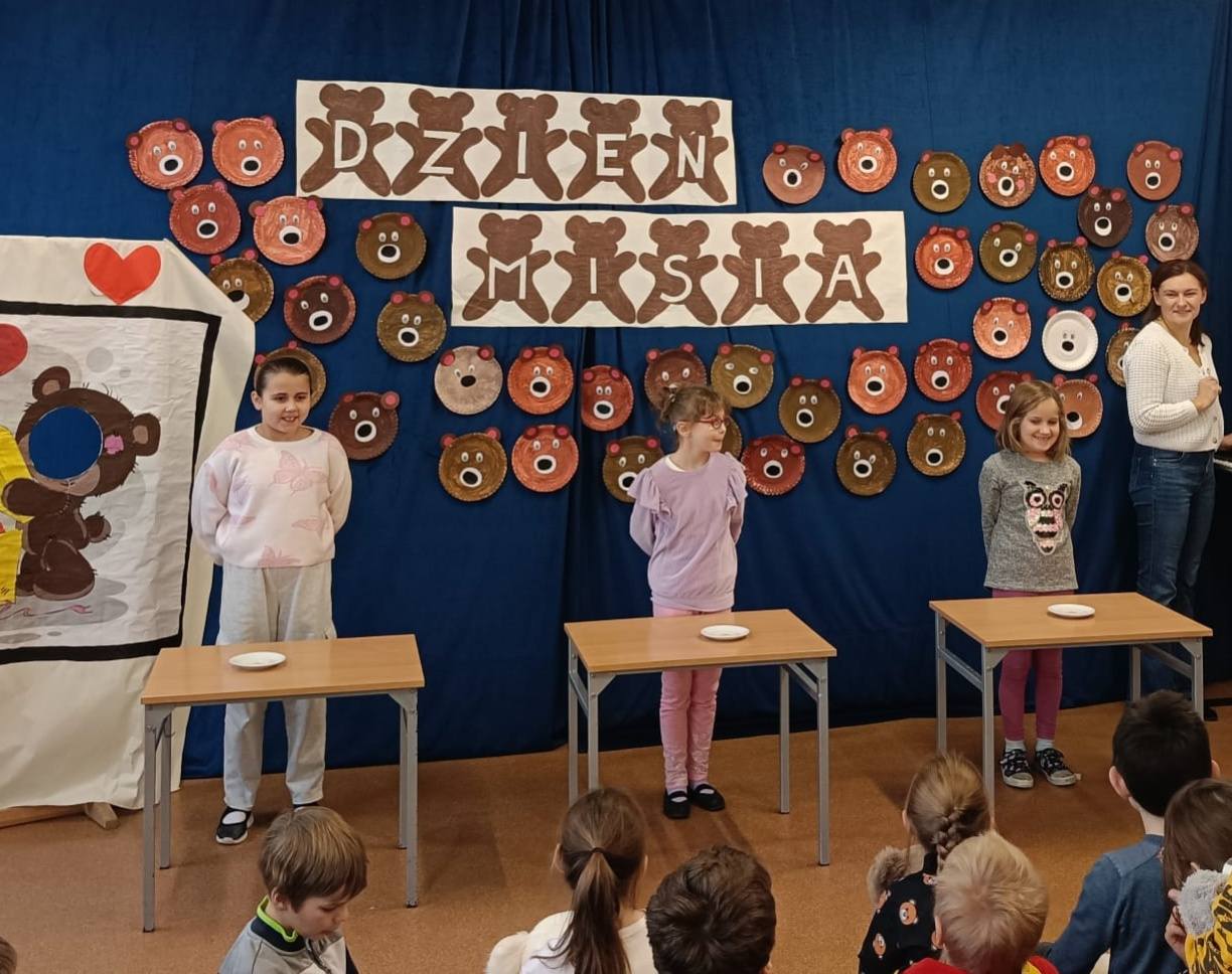 25 listopada w naszej szkole świętowaliśmy Dzień Pluszowego Misia! Cała szkoła wypełniła się puchatymi przyjaciółmi – od malutkich misiów po ogromne pluszaki! Uczniowie mieli okazję uczestniczyć w wielu zabawach i konkursach, które rozwijały wyobraźnię i kreatywność. Tworzyli własne misie z papierowych talerzyków, malując je i ozdabiając według własnego pomysłu. Rozwiązywali misiowe zagadki i łamigłówki, co wywołało mnóstwo radości i śmiechu. Śpiewali piosenki o misiach, ucząc się nowych rymowanek i melodii. Największą atrakcją okazały się tradycyjne zawody w „jedzeniu” miodu bez użycia rąk. Dzieci rywalizowały z wielkim zaangażowaniem, a publiczność nie mogła powstrzymać śmiechu, obserwując tę słodką rywalizację!