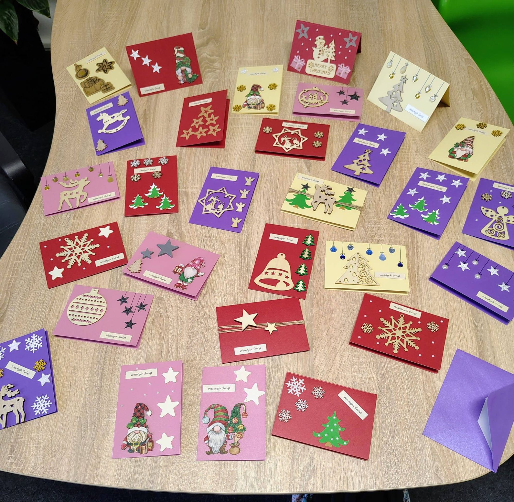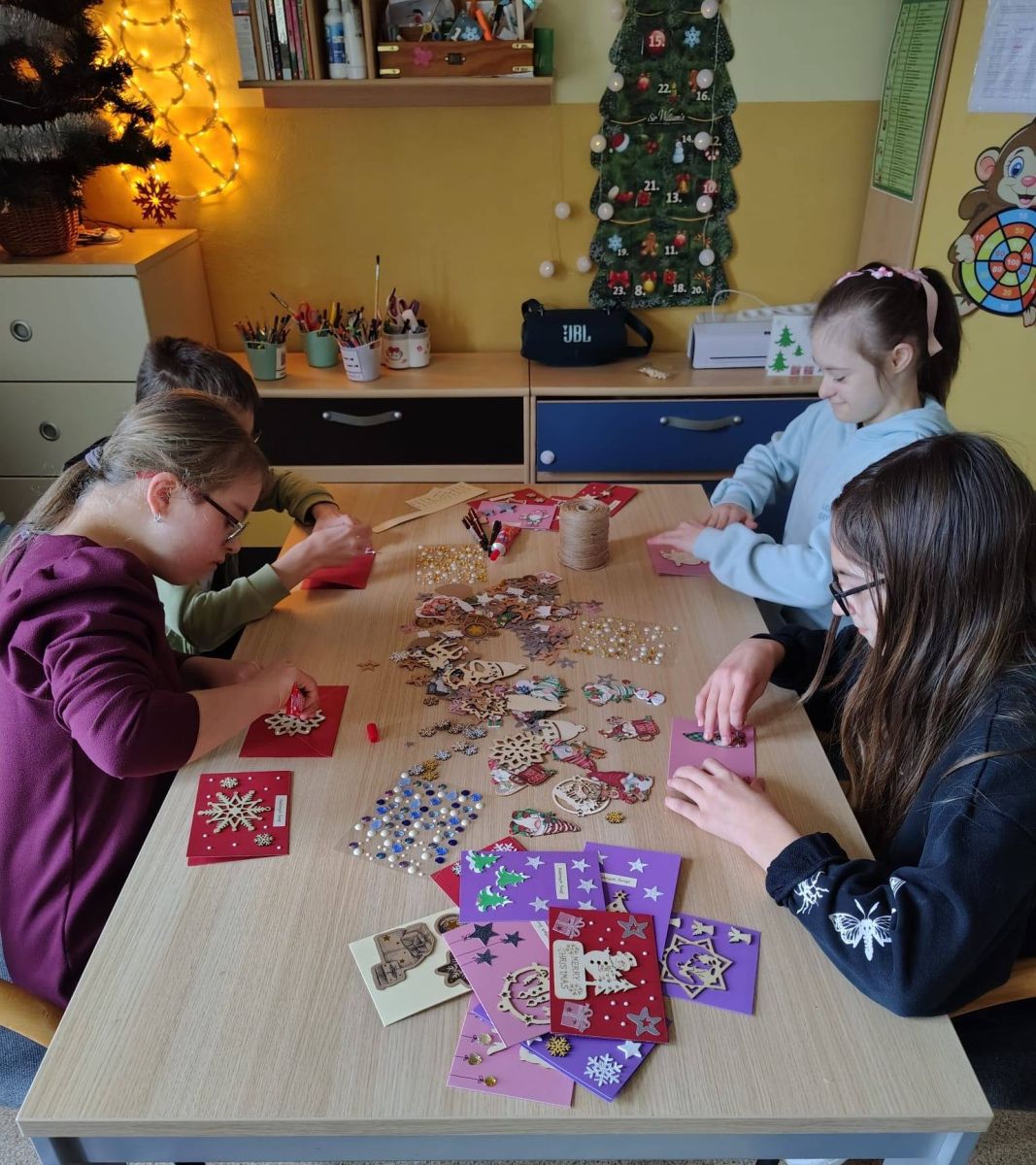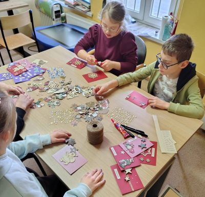 W ostatnich dniach w naszej placówce zapanowała wyjątkowa, ciepła atmosfera twórczej pracy. Uczniowie z niepełnosprawnościami, pod uważnym i serdecznym wsparciem swoich nauczycieli, przygotowywali własnoręczne kartki świąteczne. Wspólna praca przy stole, wybieranie dekoracji i rozmowy o nadchodzących świętach stworzyły niepowtarzalny klimat, który trudno opisać słowami. To nie tylko zajęcia plastyczne, ale przede wszystkim piękna lekcja współpracy, cierpliwości i radości tworzenia. Wierzymy, że te kartki wywołają uśmiech i wprowadzą świąteczne ciepło do każdego, kto je otrzyma. Jesteśmy ogromnie dumni z naszych uczniów i wdzięczni nauczycielom za ich zaangażowanie, kreatywność oraz codzienne wsparcie. To właśnie takie chwile pokazują, jak wiele możemy osiągnąć razem.
