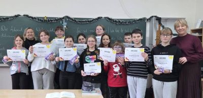 Uroczystym rozdaniem dyplomów i słodką niespodzianką zakończono kolejną edycję projektu „Deutsch AG” realizowanego w ramach współpracy ze Związkiem Niemieckich Stowarzyszeń Społeczno-Kulturalnych w Polsce. Projekt sfinansowany został przez Ministerstwo Spraw Wewnętrznych RFN. Koordynatorem i duszą projektu w naszej szkole od wielu lat jest Pani Barbara Baron. Brała w nim udział wyjątkowo liczna grupa uczniów naszej szkoły, którzy z wielkim zaangażowaniem uczestniczyli w dodatkowych dwugodzinnych zajęciach z języka niemieckiego. Celem projektu jest przede wszystkim rozwijanie kompetencji komunikacyjnych, językowych i międzykulturowych z wykorzystaniem różnorodnych narzędzi, form i metod pracy. Projekt skierowany jest do uczniów klas I–VIII. Tegoroczna edycja pokazała, że – wbrew słyszanym opiniom – zainteresowanie językiem niemieckim jest nadal duże. Nasi uczniowie z niesamowitym zaangażowaniem brali udział w zajęciach, urozmaicając je fantastycznymi pomysłami oraz wprowadzając ciepłą i słodką atmosferę. I chociaż zajęcia odbywały się popołudniem, po lekcjach szkolnych, był to zarówno dla grupy, jak i dla samego prowadzącego wyjątkowy czas – czas wspólnej nauki i zabawy, czas rozwijania pasji do języka.