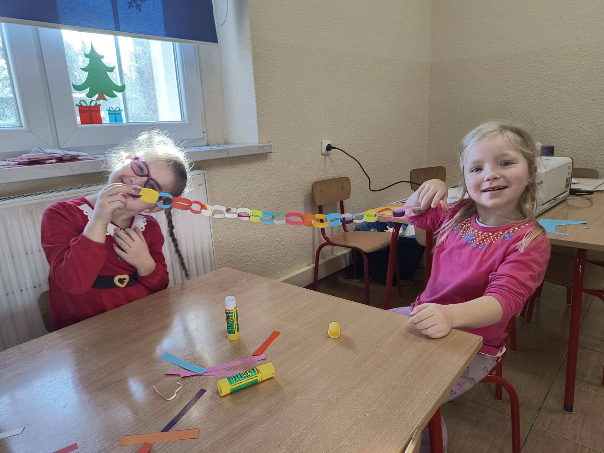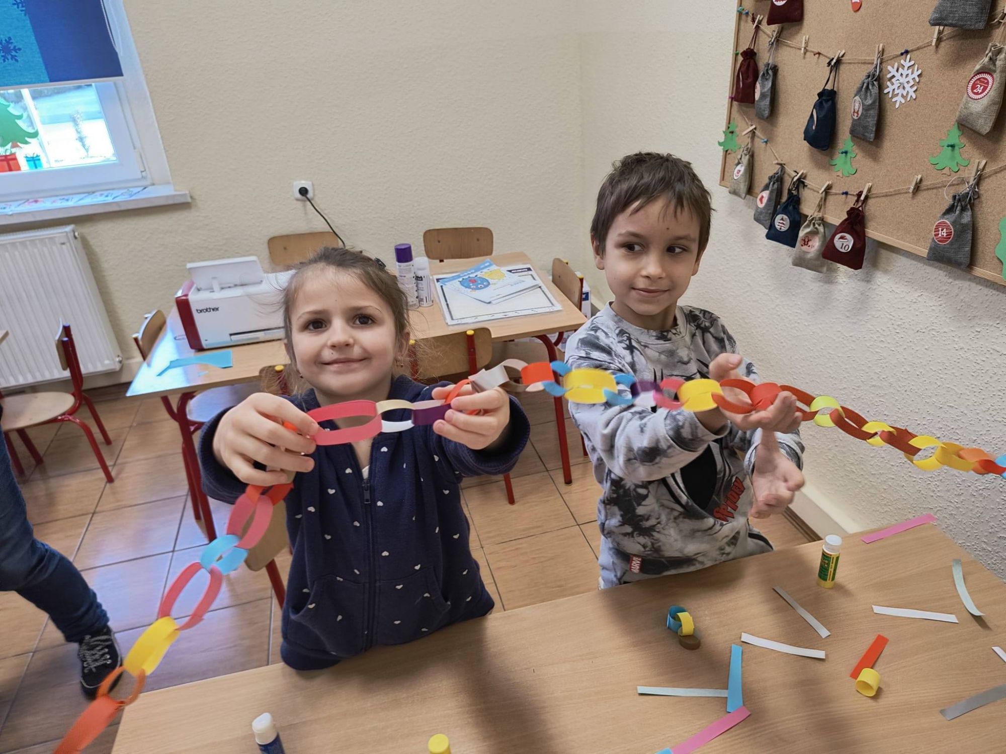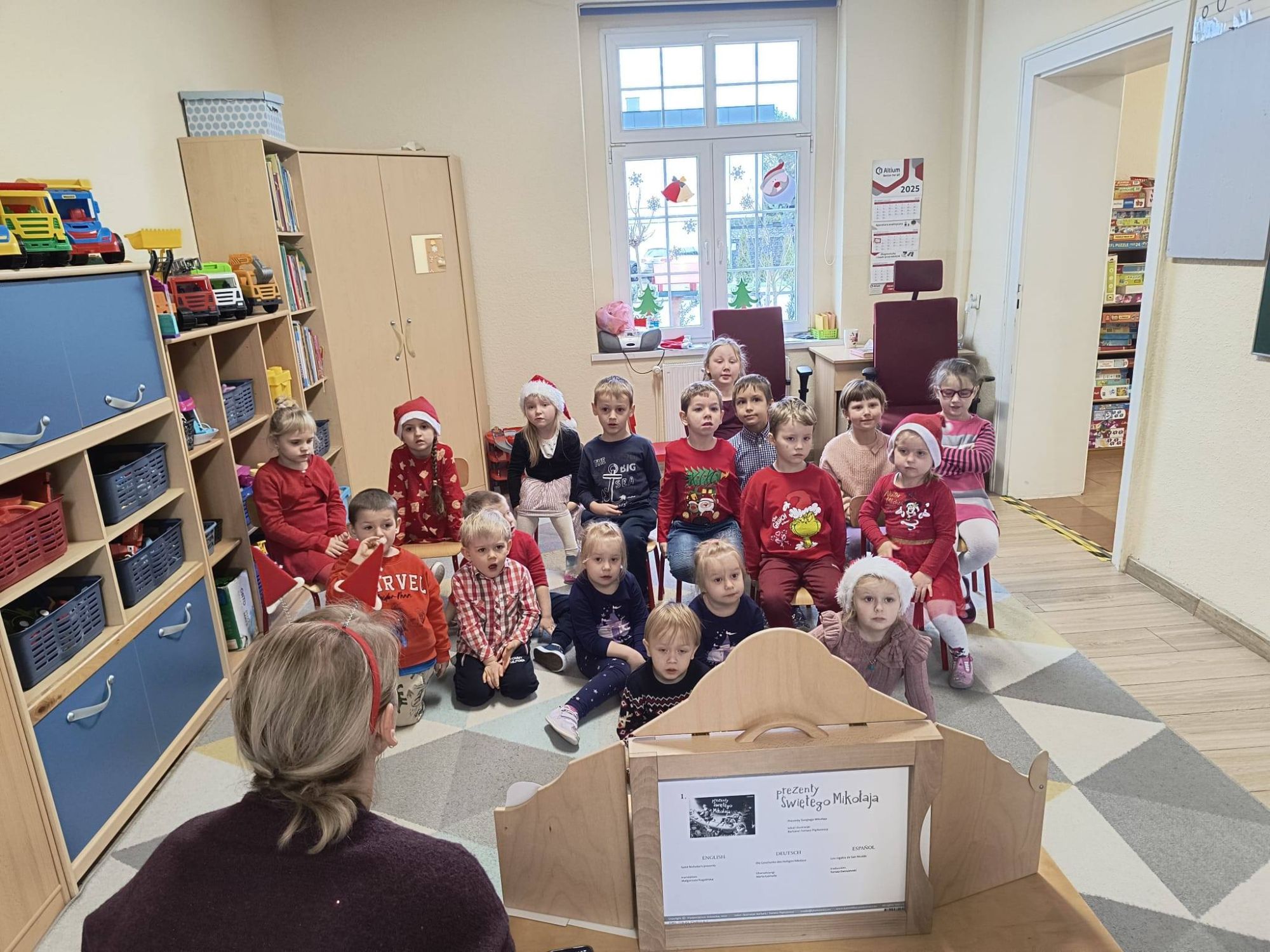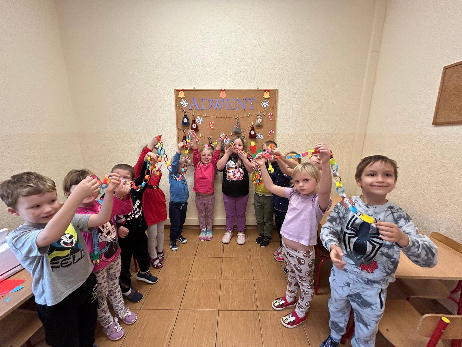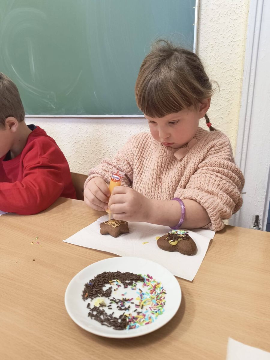 Z początkiem grudnia i Adwentu w naszym oddziale przedszkolnym zrobiło się naprawdę świątecznie! Dzieci z ogromną radością zabrały się za przygotowania — najpierw ulepiły i pomalowały ozdoby z masy solnej, które później zawiesiły na choince. Następnie wspólnie ubierały drzewko, dodając do niego mnóstwo uśmiechu i świątecznej energii. Podczas przygotowań powstał też kolorowy, papierowy łańcuch — tworzony z rozmowami, śmiechem i prawdziwym zaangażowaniem. Nie zabrakło również wyjątkowego gościa — odwiedził nas Święty Mikołaj! Dzieci dzieliły się wrażeniami, zadawały pytania, a radości nie było końca. Gościliśmy także panią Agatę z biblioteki, która przeniosła nas w świąteczny świat dzięki pięknej opowieści przedstawionej w formie teatrzyku kamishibai. To właśnie wtedy odbyła się wspólna dekoracja pierniczków, która sprawiła wszystkim mnóstwo słodkiej radości. Cieszymy się, że możemy wspólnie przeżywać ten piękny, przedświąteczny czas — pełen magii, twórczej zabawy i radosnych chwil.