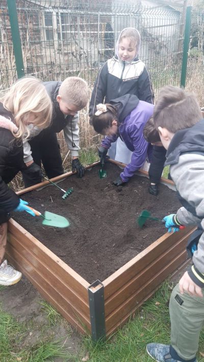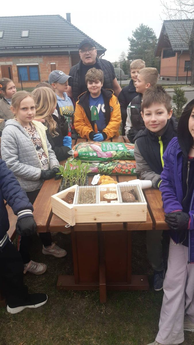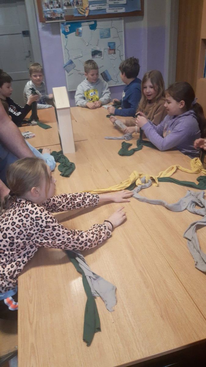 W poniedziałek w klasie 3 odbyły się warsztaty, na których gościem był tata jednego z uczniów – p. Krzysztof. Uczniowie wykonali szarpaki dla psów ze schroniska. Było to trudne zadanie, gdyż nie wszyscy uczniowie umieli sobie poradzić ze zrobieniem warkocza. Jednak praca przebiegała w miłej i serdecznej atmosferze. Wykonane szarpaki trafią do schroniska, gdzie będą miłą zabawką dla piesków. W drugiej części warsztatów uczniowie przygotowywali ogródek do wiosennych prac. Zawiesili domek dla owadów. Zasiali nasiona i posadzili sadzonki. A teraz będzie czas na pielęgnowanie i obserwowanie rozwoju roślinek.